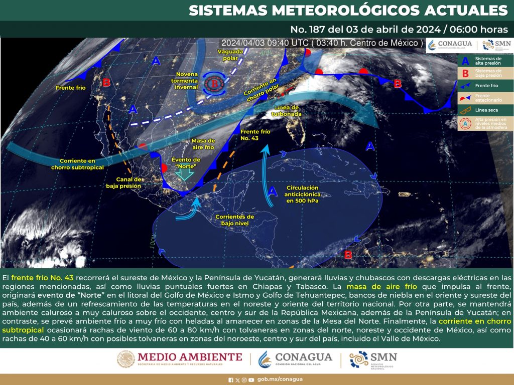 MÉRIDA, Yuc., 3 de marzo de 2024.- Este miércoles por la tarde se espera la llegada del frente frío 43 el cual se prevé que ocasione lluvias en varias zonas del estado acompañadas de actividad eléctrica, turbonadas y granizo aislado en el oriente de Yucatán.