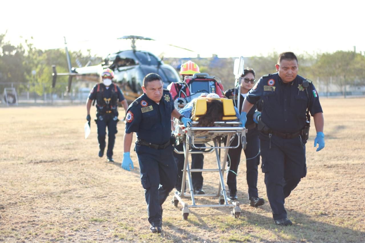 MÉRIDA, Yuc., 13 de abril de 2024.- Tras sufrir un fuerte accidente mientras atendían una emergencia, dos jóvenes paramédicas de la Policía Municipal de Valladolid fueron trasladadas a Mérida en los helicópteros Bell 407 y Bell 429 de la Secretaría de Seguridad Pública (SSP).