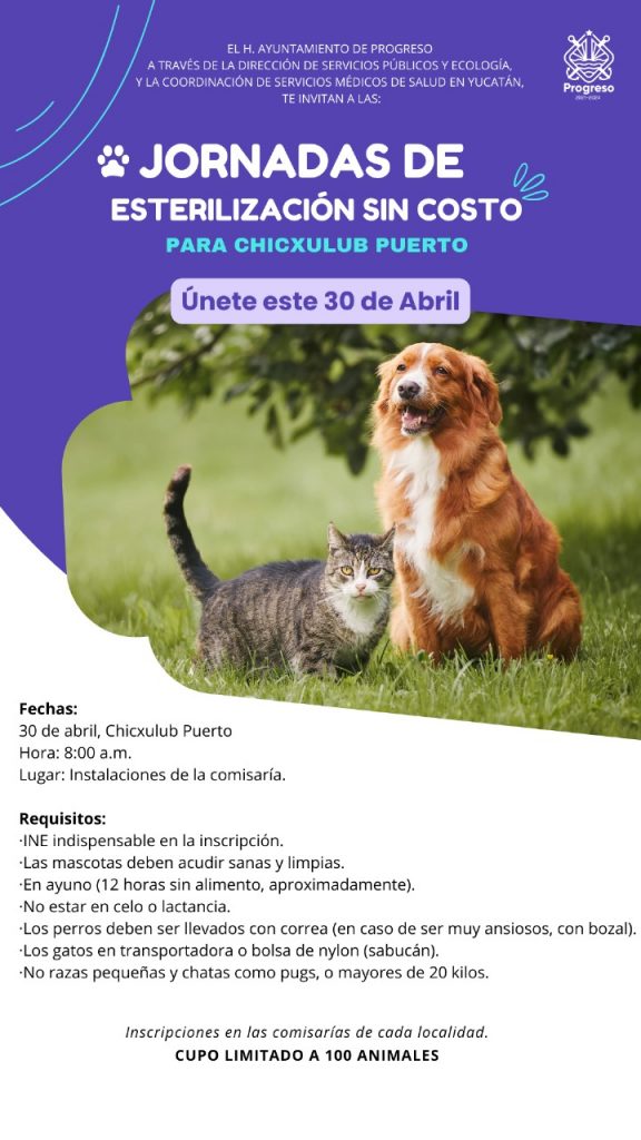 PROGRESO, Yuc., 25 de abril 2024. El próximo martes 30 de abril, a partir de las 8 de la mañana, se llevará a cabo la Jornada de Esterilización Canina y Felina sin Costo en las instalaciones de la comisaría del puerto de Chicxulub, así lo informó el subdirector de Ecología, Augusto Navarrete Hevia.