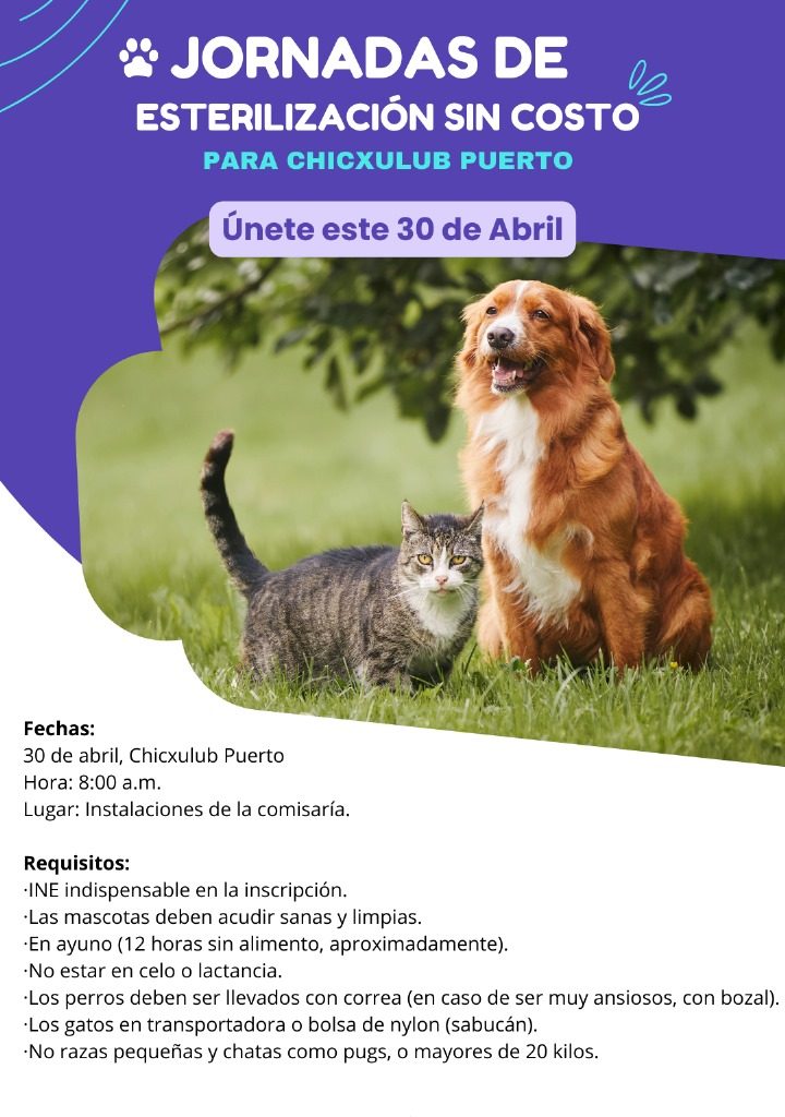 PROGRESO, Yuc., 25 de abril 2024. El próximo martes 30 de abril, a partir de las 8 de la mañana, se llevará a cabo la Jornada de Esterilización Canina y Felina sin Costo en las instalaciones de la comisaría del puerto de Chicxulub, así lo informó el subdirector de Ecología, Augusto Navarrete Hevia.
