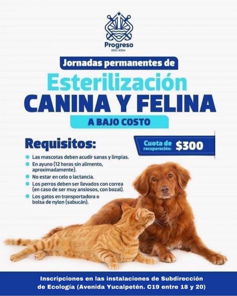 PROGRESO, Yuc., 14 de mayo de 2024. El alcalde Roger Gómez Ortegón hace una atenta invitación a aquellos dueños de mascotas a inscribir a sus gatitos o perritos a la Jornada de Esterilización Canina y Felina a Bajo Costo del 2024.