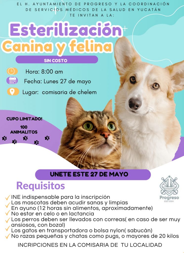 PROGRESO, Yuc., 22 de mayo de 2024.- El Ayuntamiento de Progreso y la Coordinación de Servicios Médicos de la Salud en Yucatán realizarán la próxima Jornada de Esterilización Canina y Felina Sin Costo el lunes 27 de mayo, a partir de las 8 de la mañana en las instalaciones de dicha comisaría.