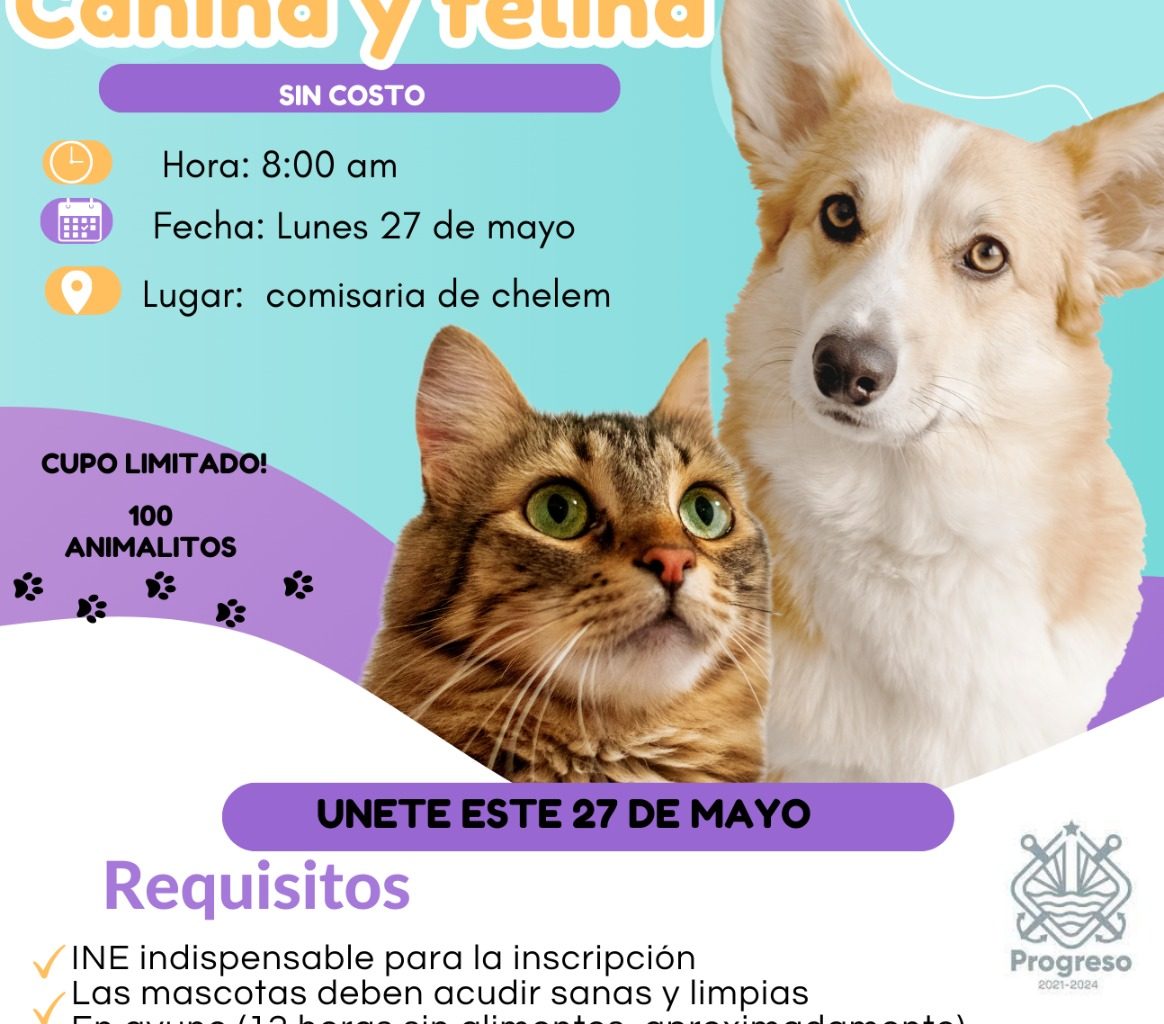 PROGRESO, Yuc., 22 de mayo de 2024.- El Ayuntamiento de Progreso y la Coordinación de Servicios Médicos de la Salud en Yucatán realizarán la próxima Jornada de Esterilización Canina y Felina Sin Costo el lunes 27 de mayo, a partir de las 8 de la mañana en las instalaciones de dicha comisaría.