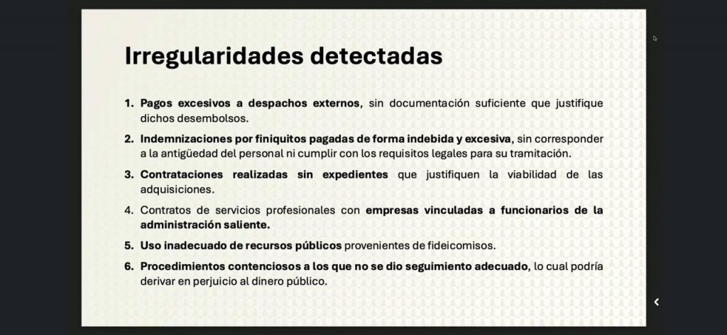 Adicionalmente, dijo, en la revisión se identificó una reclasificación de recursos por 150.3 millones de pesos que no había sido aplicada, así como adeudos adicionales por 136 millones de pesos que no estaban documentados en el sistema, además, las entidades reportaron compromisos pendientes por 104 millones de pesos sin fondos asignados para cubrirlos.