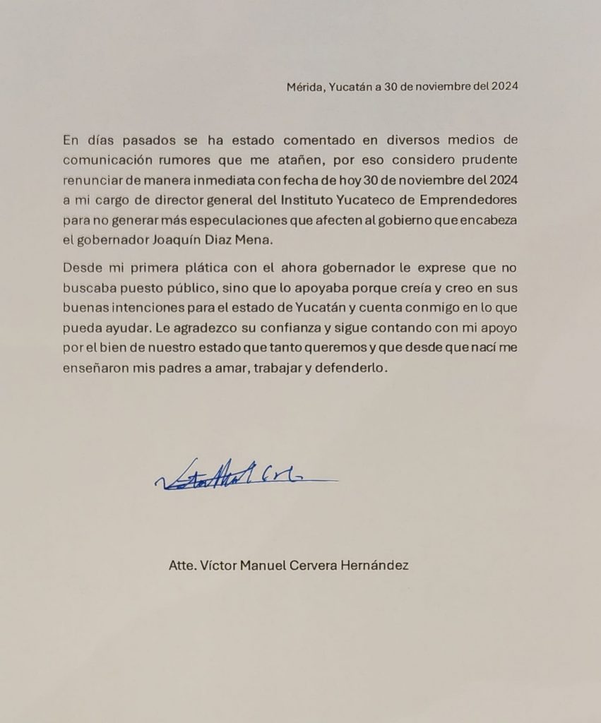 Dentro de la carta que mostró, y que sería la que presentó al Gobierno de Yucatán fechada este sábado 30 de noviembre, indica que lo hace “para no generar más especulaciones que afecten al gobierno que encabeza el gobernador Joaquín Diaz Mena”.