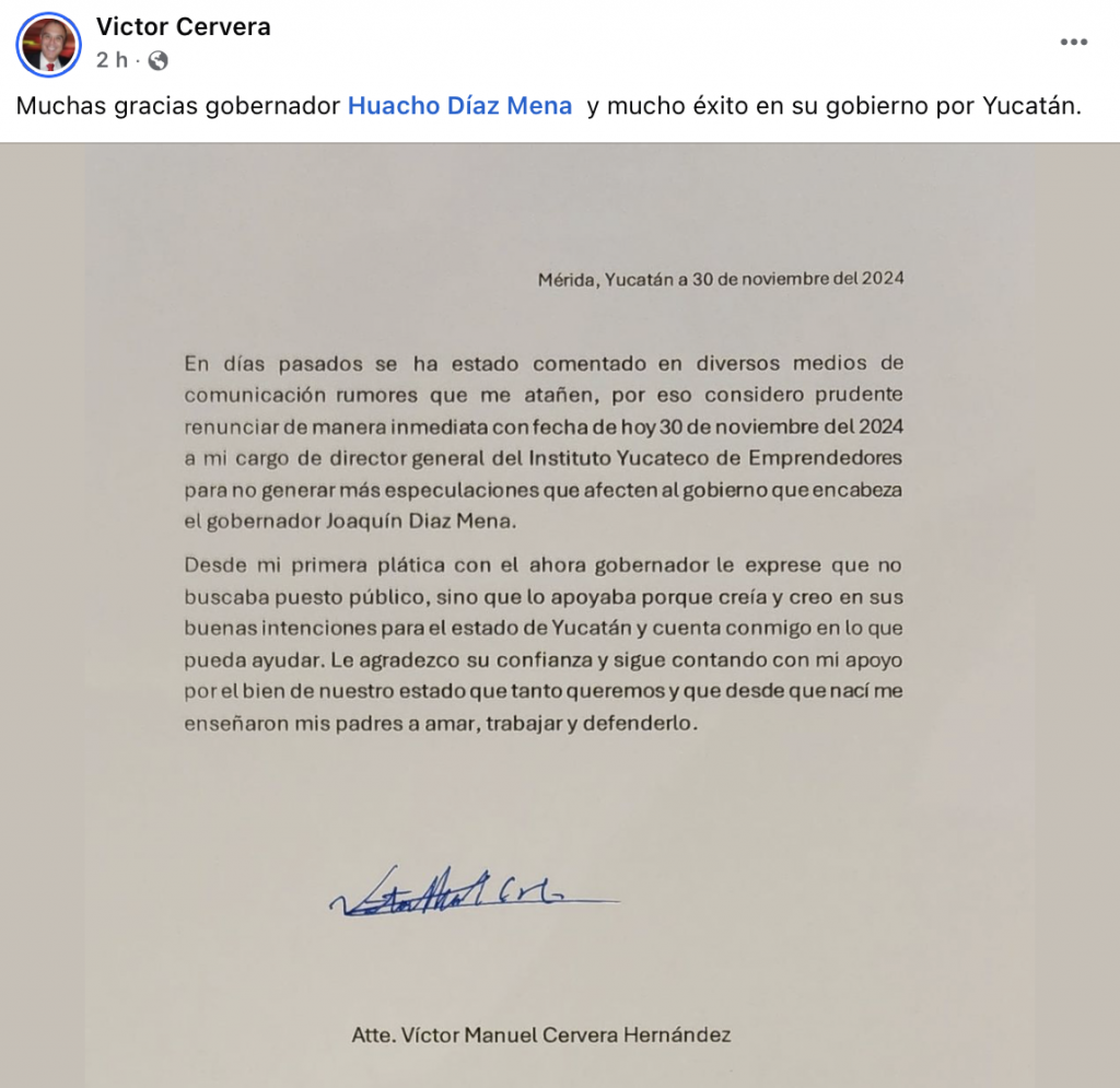 Dentro de la carta que mostró, y que sería la que presentó al Gobierno de Yucatán fechada este sábado 30 de noviembre, indica que lo hace “para no generar más especulaciones que afecten al gobierno que encabeza el gobernador Joaquín Diaz Mena”.