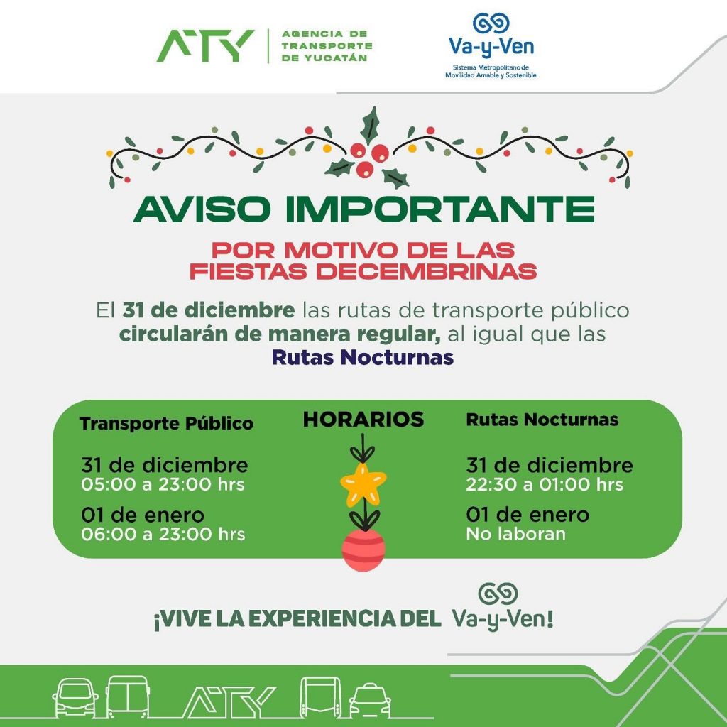 Mérida, Yuc., 31 de diciembre de 2024.- La Agencia de Transporte de Yucatán (ATY) informó que el servicio de transporte público funcionará con normalidad durante los festejos de Año Nuevo para que todas las familias yucatecas lleguen seguras a sus destinos.