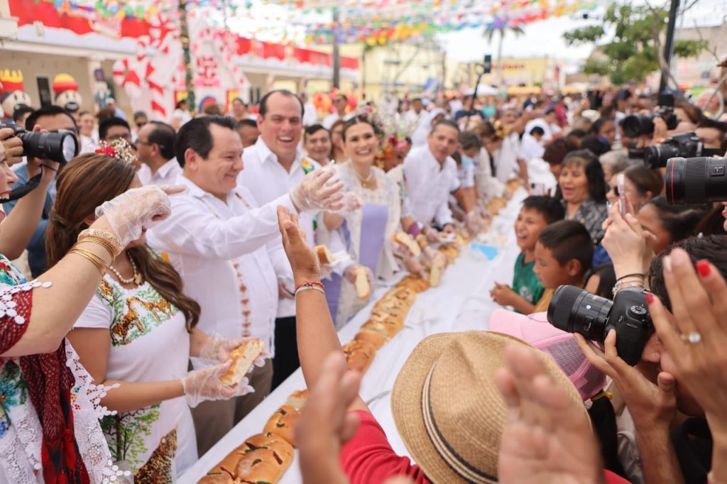 Posteriormente, el Gobernador participó, junto con el alcalde tizimileño, Carlos Adrián Quiroz Osorio, y la presidenta del DIF municipal, Lina Fernández Alcocer, en el tradicional corte de una rosca de 150 metros lineales en la Plaza Principal de esta localidad.