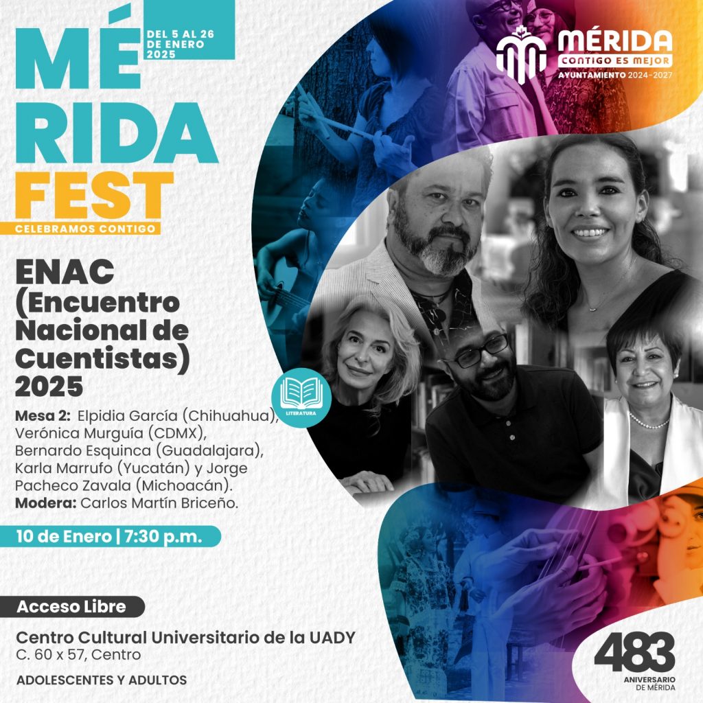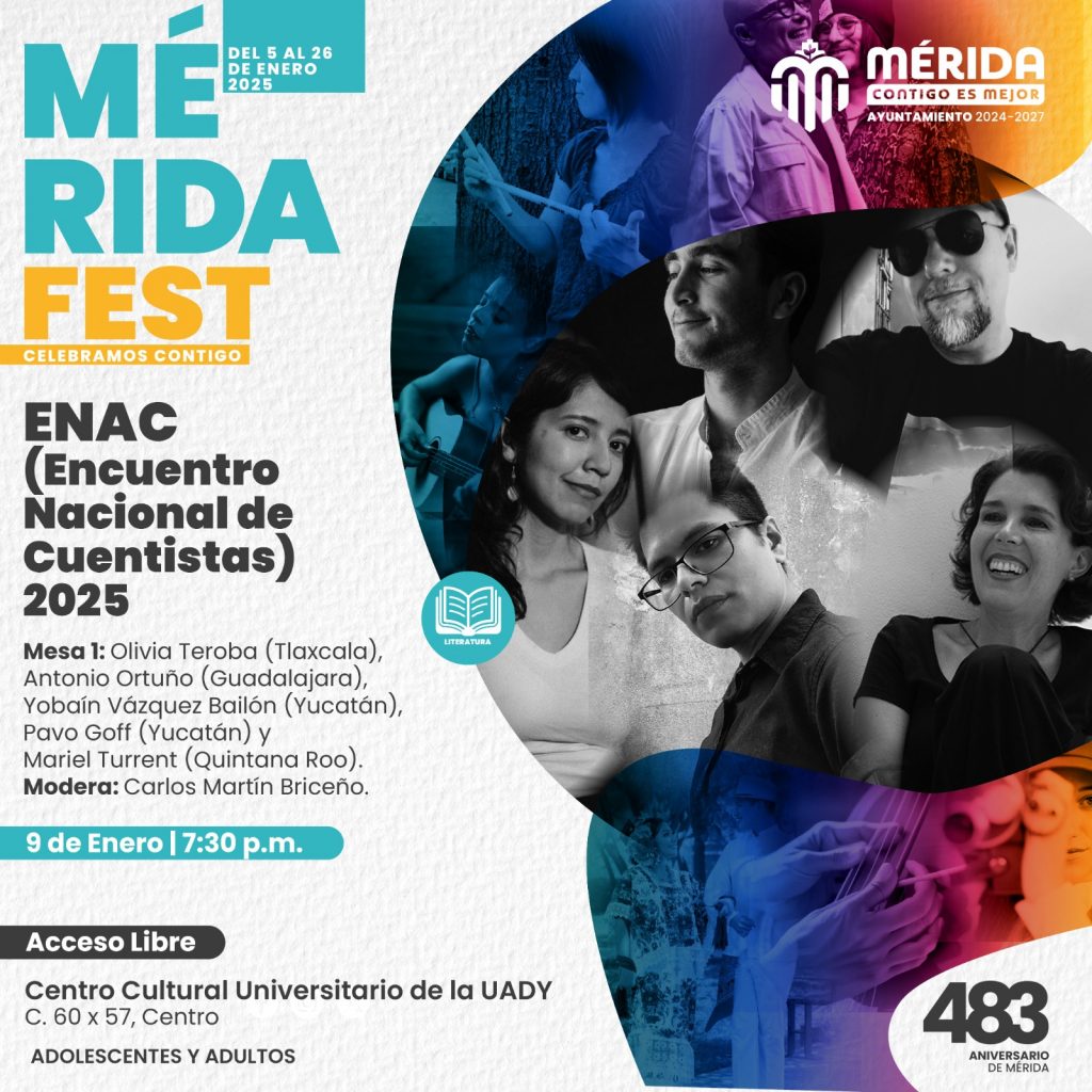 Mérida, Yuc., 7 de enero de 2025.- Por cuarta ocasión, el cuento estará presente en el Mérida Fest con el Encuentro Nacional de Cuentistas (ENAC Mérida) que se realizará el 9 y 10 de enero en la capital yucateca.