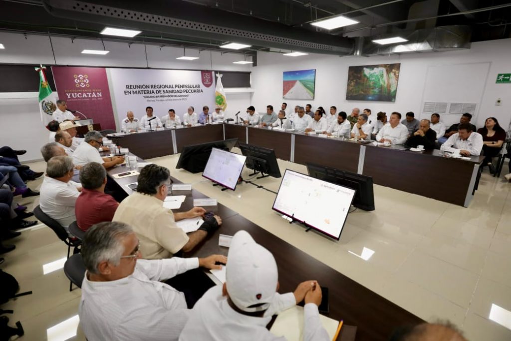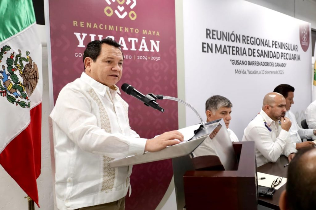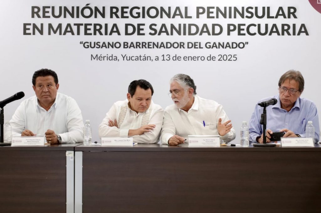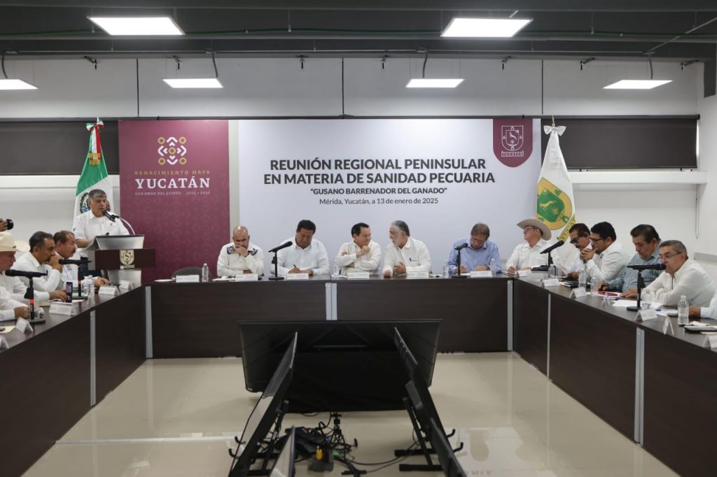 Mérida Yuc., 13 de enero de 2025.- En un esfuerzo conjunto para establecer estrategias en los rubros de infraestructura, operación y procedimientos que protejan y promuevan el estatus sanitario de la región, el Gobernador Joaquín Díaz Mena encabezó la primera Reunión Regional Peninsular en materia de sanidad pecuaria, con la que también se busca fortalecer las acciones contra el Gusano Barrenador del Ganado.