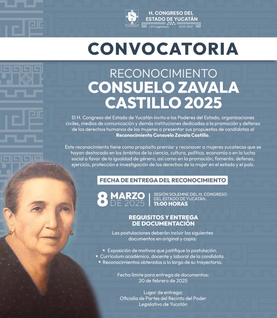 Para más información, se puede consultar la convocatoria en la página web: https://congresoyucatan.gob.mx/convocatorias/CONVOCATORIA_CONSUELO_ZAVALA.pdf).