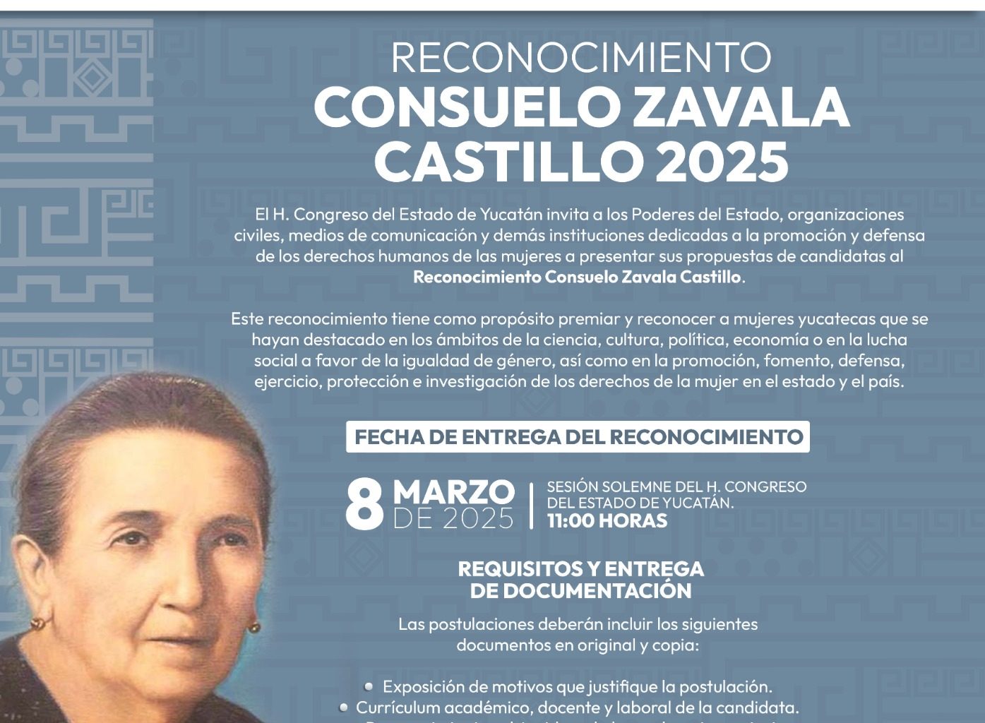Para más información, se puede consultar la convocatoria en la página web: https://congresoyucatan.gob.mx/convocatorias/CONVOCATORIA_CONSUELO_ZAVALA.pdf).