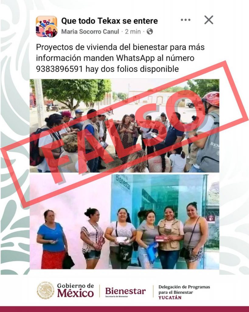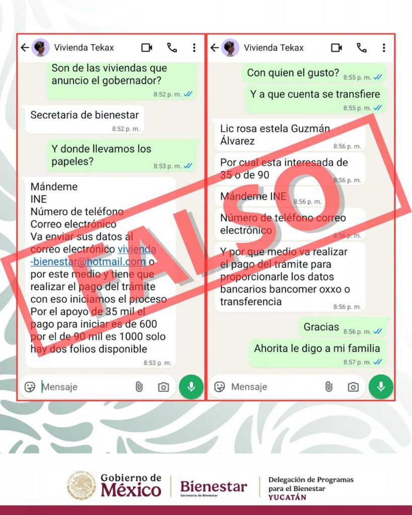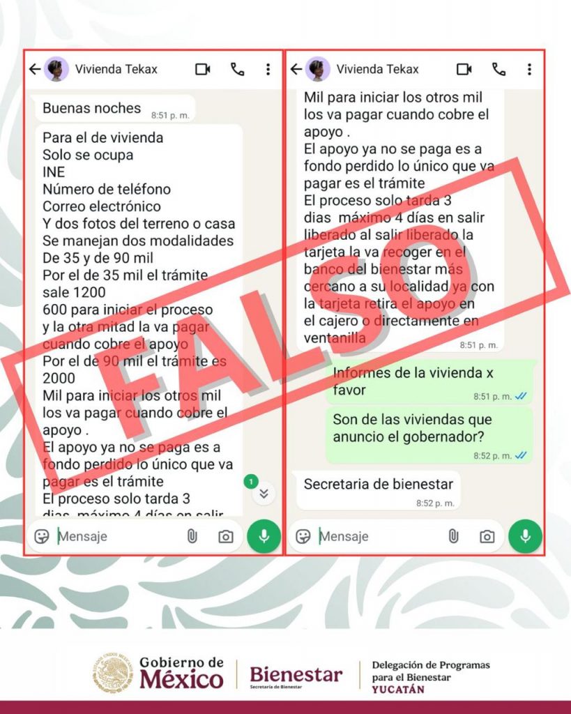 Actualmente, circula en redes sociales y por mensajes de WhatsApp el ofrecimiento de supuestos apoyos de vivienda por parte de la Secretaría de Bienestar, a través de la Delegación Regional, que se gestionan con pagos de mil 200 y dos mil pesos, detalló en un comunicado.
