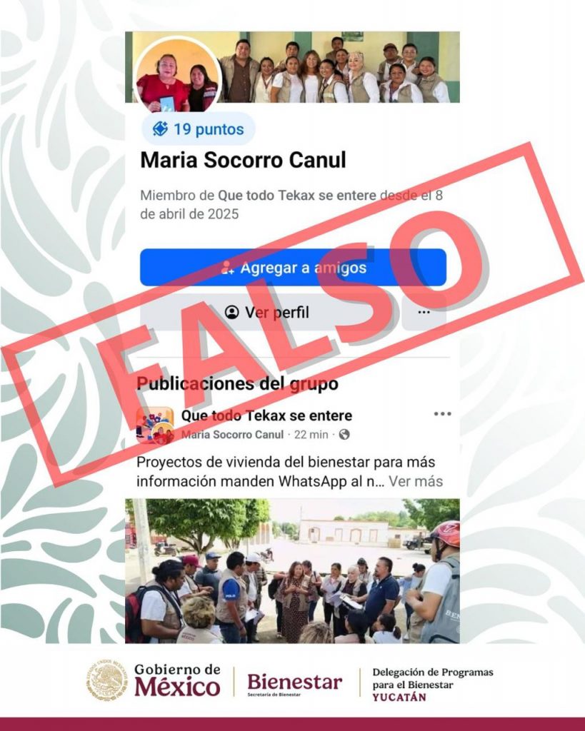Asimismo, recordó no caer en el engaño del perfil presuntamente falso de “Maria Socorro Canul”, ni hacer caso del número de teléfono 9383896591 y mucho menos enviar información al correo vivienda-bienestar@hotmail.com.