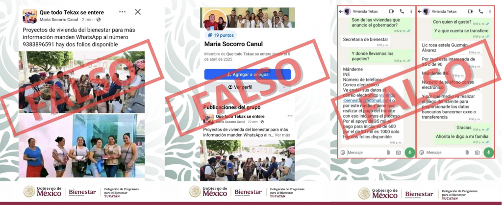 Asimismo, recordó no caer en el engaño del perfil presuntamente falso de “Maria Socorro Canul”, ni hacer caso del número de teléfono 9383896591 y mucho menos enviar información al correo vivienda-bienestar@hotmail.com.