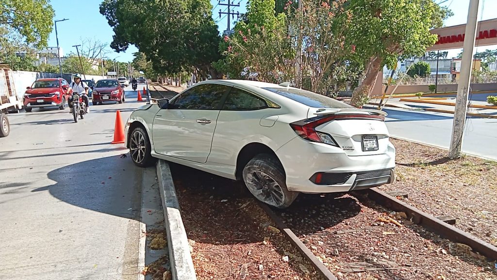 Por la velocidad que llevaba, el conductor del auto perdió el control del volante y se subió al camellón central en donde quedó atorado con los antiguos rieles del tren.