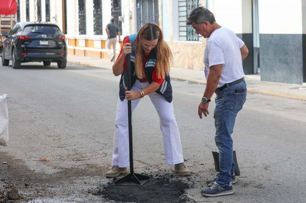 Posteriormente se trasladó a calles del centro, acompañada del director de Obras Públicas, Sergio Chan Lugo, donde supervisó y colaboró en los primeros trabajos de esta medida extraordinaria que impactará de manera positiva en el mantenimiento de las vialidades.